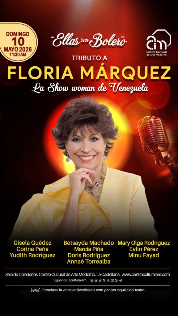 En el Día de las Madres, el Centro Cultural de Arte Moderno presenta una emotiva edición del exitoso espectáculo Ellas son Bolero: un tributo a Floria Márquez, cuya trayectoria ha dejado una huella imborrable en generaciones de intérpretes y en los amantes del bolero. Acompañadas por una banda de lujo, diez de las voces femeninas más destacadas de la escena nacional se unirán en esta gala inolvidable. Ellas harán vibrar al público con los boleros más emblemáticos y los éxitos que marcaron la carrera de la eterna «Show Woman de Venezuela», como Hoy es viernes, El gorrión, Punto y coma o Soy lo prohibido, entre otros.