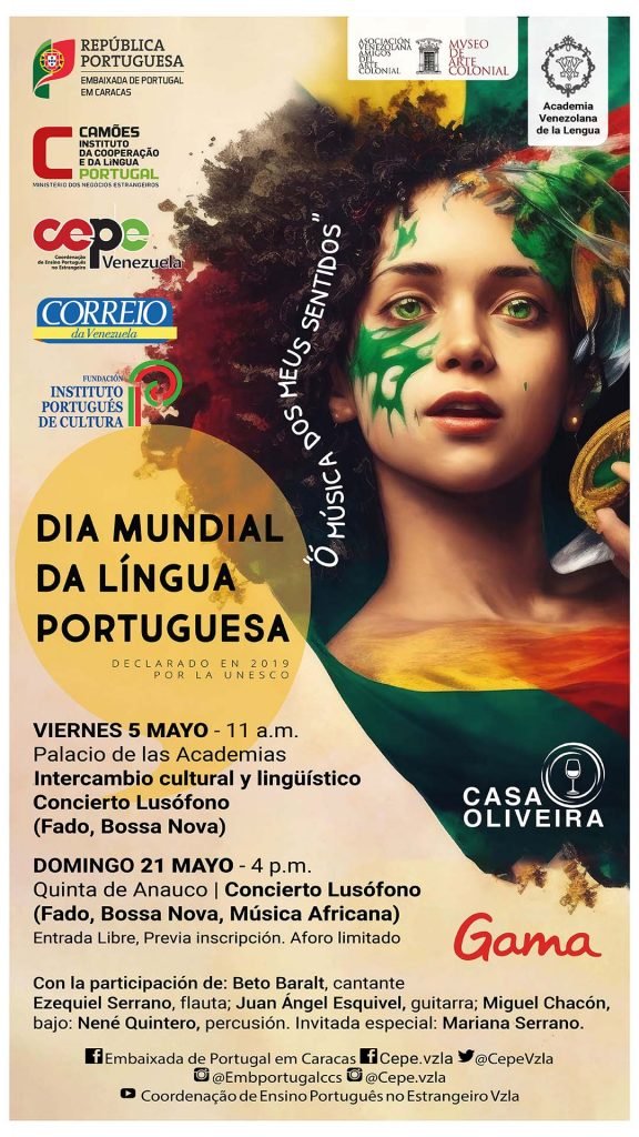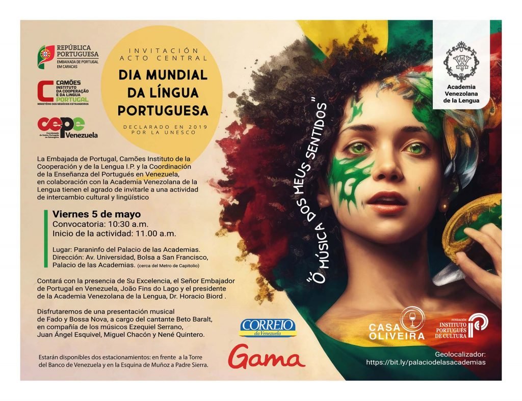Bajo el lema «Ó música de meus sentidos», una frase del poeta Eugénio de Andrade, uno de los escritores homenajeados de este año, la Embajada de Portugal en Caracas, Camões Instituto de la Cooperación y de la Lengua I.P., la Coordinación de la Enseñanza de la Lengua Portuguesa (CEPE Venezuela) y el Correio da Venezuela junto al Instituto Portugués de Cultura (IPC), la cadena de supermercados GAMA y Casa Oliveira han estrechado sus esfuerzos para conmemorar el 5 de mayo el Día Mundial de la Lengua Portuguesa, declarado en 2019 por la Unesco.