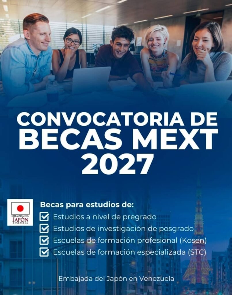 La Embajada del Japón en Venezuela anuncia la apertura del proceso de postulaciones correspondiente al año 2027, para las becas ofrecidas por el gobierno del Japón a través del Ministerio de Educación, Cultura, Deportes, Ciencia y Tecnología del Japón: MEXT (Monbukagakusho). Los programas de becas incluyen estudios de investigación a nivel de posgrado, pregrado, estudios técnicos en escuelas de formación profesional y estudios superiores en escuelas de formación especializada.
