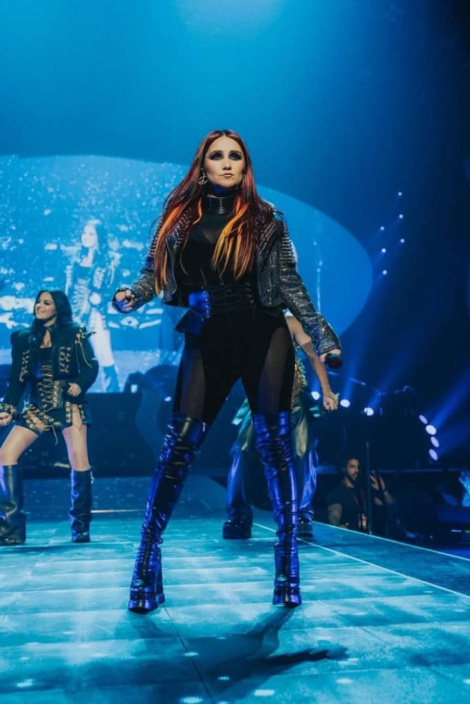Dulce María ha deslumbrado con 10 looks en el escenario, cada uno de ellos repleto de referencias que transportan a distintas épocas. Destacan sus llamativas botas over-the-knee en varios colores, las hombreras con características únicas y, por supuesto, su emblemático símbolo de la paz, que se hace presente en diferentes momentos y lugares durante su actuación. Este espectáculo es realmente un viaje en el tiempo.