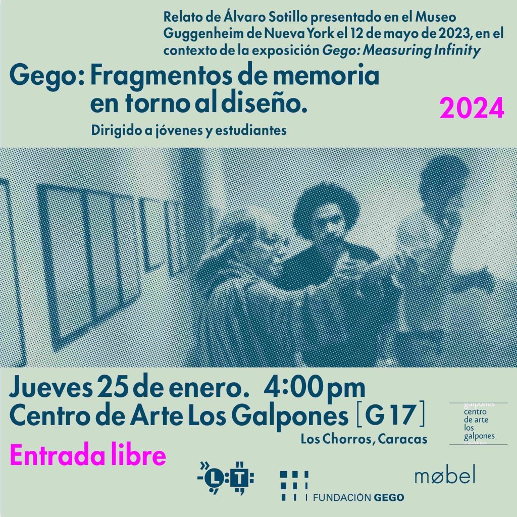 «Gego: Fragmentos de memoria en torno al diseño» se llevará a cabo el jueves 25 de enero de 2024 a las 4:00 p.m., en el (G17) del Centro de Arte Los Galpones (avenida Ávila con 8va transversal de Los Chorros, Caracas). La entrada es libre.