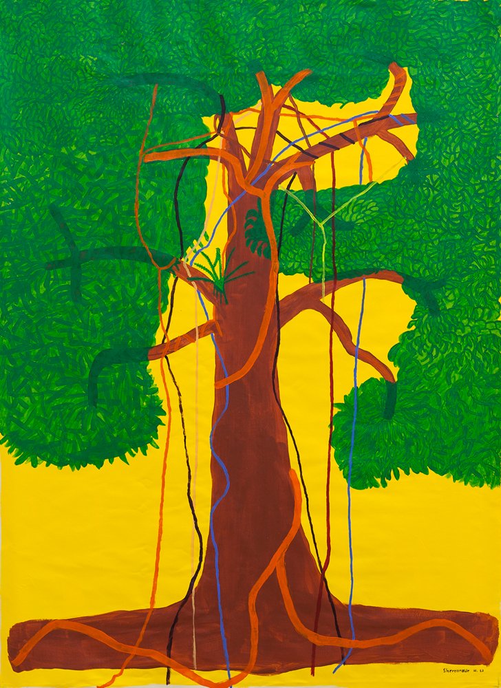 En la exhibición, curada por el artista Luis Romero, se podrán apreciar una selección de dibujos realizados por Pebio González Silva, sobreviviente de la masacre, en los que refleja algunas escenas de la tragedia, su cultura y su pueblo. En torno a ellos se incluyen una variedad de pinturas de Sheroanawe Hakihiiwe, Deya Yakirahiwe y Nelly Sheimi y una serie de ollas hechas con barro cocido de Javier Puunawe, que representan sus tradiciones y la selva que rodea a su comunidad Yanomami. De igual manera, en sala estarán expuestas 3 obras de Lucía Vera, 6 fotografías de Oscar Noya, una caja de cartón construida con materiales recuperados del bosque de Ana María Mazzei y un collage de Romero. Todas estas piezas representan de alguna manera al Amazonas y a los indígenas. Asimismo, se podrá disfrutar del cortometraje PUHI TROPAO (Estar feliz) de Carol Cazares Defaz.