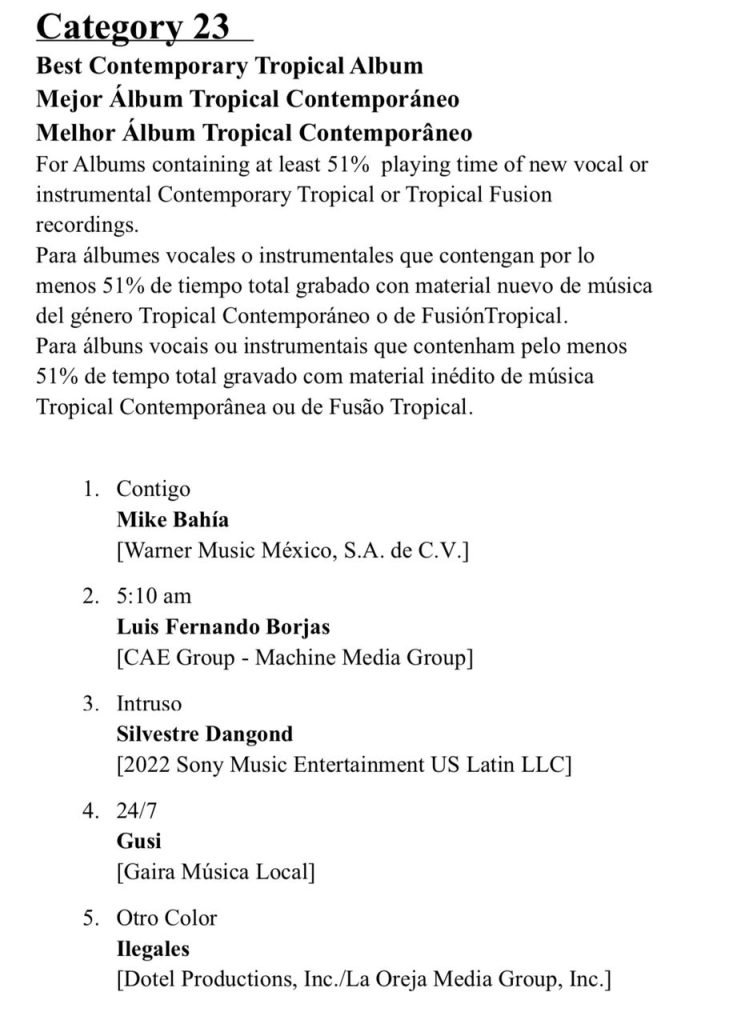 «Qué alegría tan grande, qué emoción tengo. Mi primer álbum como solista nominado como Mejor Álbum Tropical Contemporáneo. Gracias a la academia Latin Grammy, a todos los miembros, a todos mis amigos, que son hermanos y que participaron, celebro con ustedes esta nominación. Los quiero inmenso», expresó el intérprete al conocer la noticia.