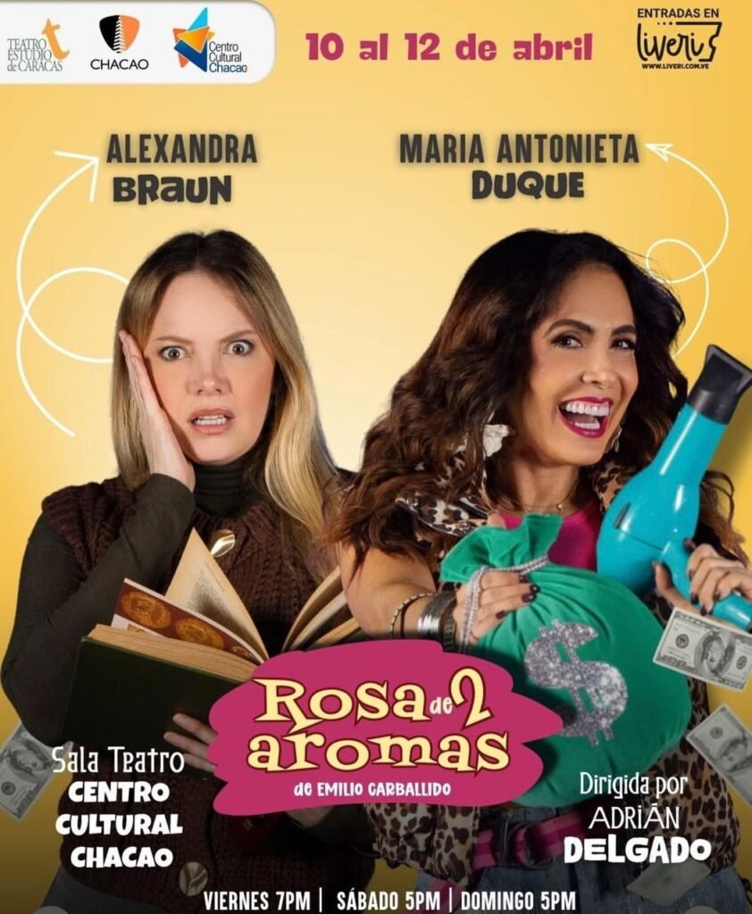 - El 10 de abril a las 7:00 pm se estrena en el Centro Cultural Chacao la comedia Rosa de dos aromas, que permanecerá en cartelera solo hasta el 12 de abril.