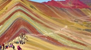 En la región andina de Cusco se encuentra Vinicunca. Ubicada a una altitud de 5,200 metros sobre el nivel del mar, estas montañas son un lienzo de la naturaleza. Sus coloridas franjas rojas, amarillas, verdes y azules, son el resultado de la «erosión de diferentes sedimentos minerales» a lo largo de millones de años. Originalmente cubiertas por una capa de hielo, las montañas revelaron su color debido a la desaparición del glaciar.