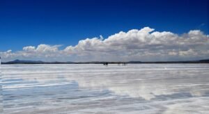 En el altiplano boliviano se encuentra el desierto de sal más grande del mundo. Con una extensión de aproximadamente 10,000 kilómetros cuadrados, este paisaje blanco es un lugar turístico muy concurrido en el país. Sin embargo, su magia se destaca durante la temporada de lluvias, cuando una capa de agua lo transforma en un espejo. Este fenómeno crea una ilusión óptica donde se fusiona el cielo y la tierra en un solo reflejo.