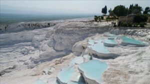 En el sudoeste de Turquía, se encuentra un espacio compuesto de terrazas de travertino, formadas por el agua termal rica en minerales que fluye por las laderas. Las piscinas naturales escalonadas de un blanco puro crean un contraste ideal con el paisaje adyacente. Además de su belleza natural, Pamukkale alberga las ruinas de la antigua ciudad de Hierápolis, que incluye un teatro romano y una necrópolis.